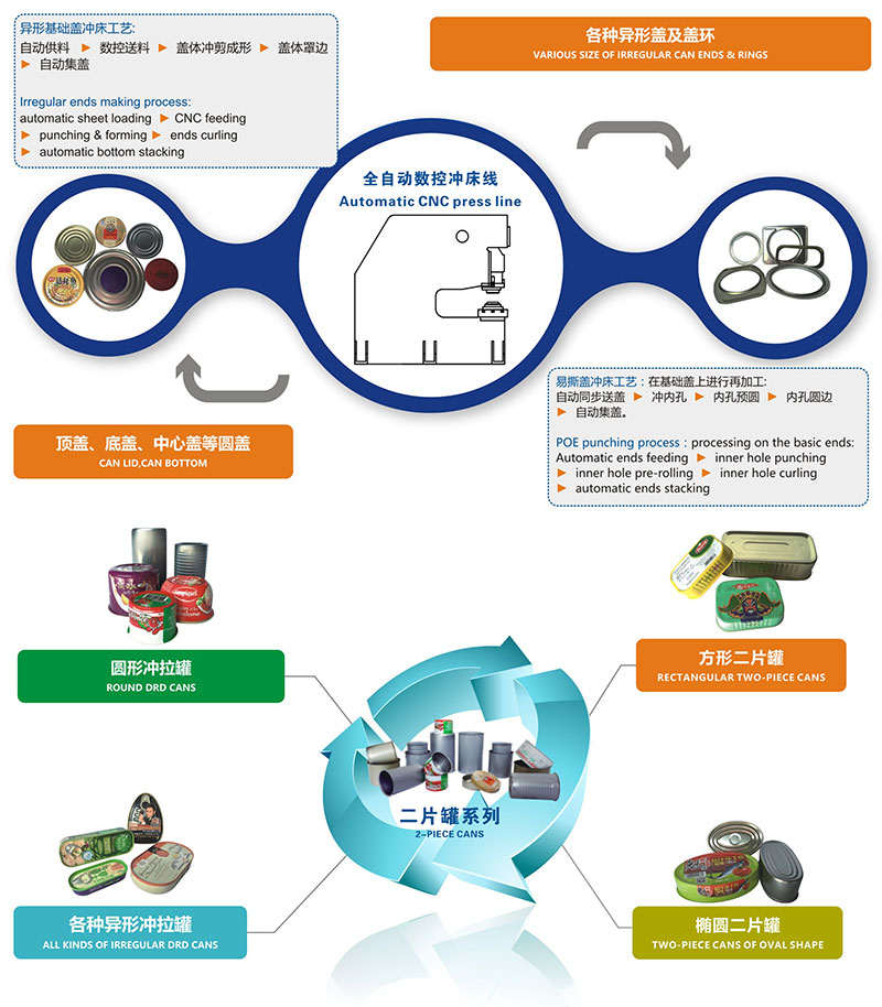 Shantou Xinglian CNC Co., Ltd., a subsidiary of Shantou Xinqing Can Machine Co., Ltd., is committed to the research and production of two-piece can punching and pulling equipment. The equipment has the characteristics of high efficiency, low failure, intelligence, and manual safety, and is suitable for producing various round cans, square cans, and elliptical cans; According to actual production capacity requirements, single or multiple channels can be customized.